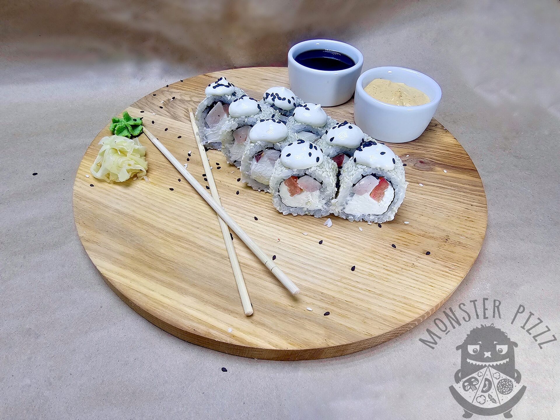 в ролл входит: соевый соус 30гр, имбирь 30гр, васаби 10гр