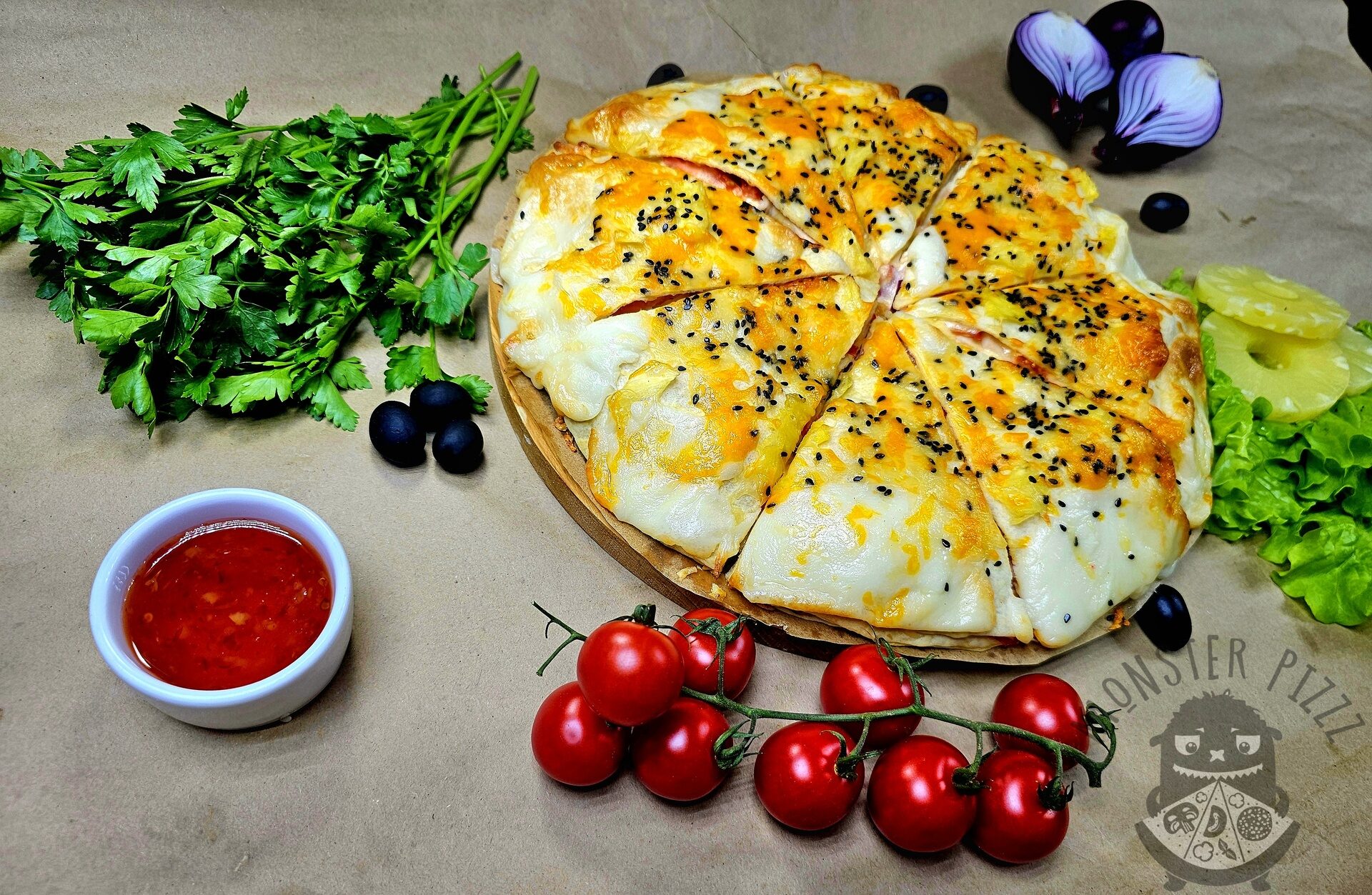 томаты, копчёная грудка, ветчина, ананасы, лук красный, соус от шефа, сыр моцарелла, сыр чеддер, кунжут черный