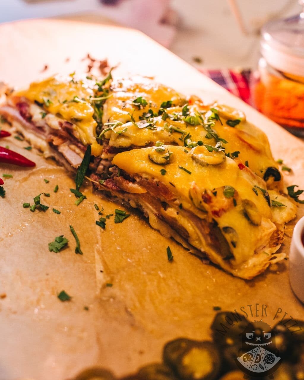 томаты, карбонад свиной, салями, красный лук, огурчики маринованные, перец чили, перец халапеньо, маслины, два вида фирменных соуса, сыр моцарелла, сыр чеддер